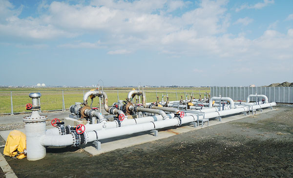 天然ガスはガス分離設備中でかん水から自然に分離し、集ガスパイプラインを通って事業所に集められ、送ガスパイプラインにより都市ガス事業者などに送られます。